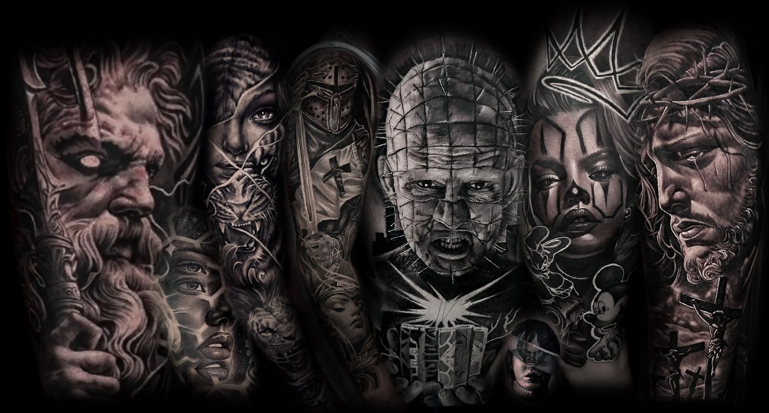 A collage of detailed black and gray tattoos featuring various themes, including mythological figures, a woman with a tiger, a medieval knight with a cross, a character with a pin-covered head, a woman with clown makeup, and religious imagery like crucifixion.